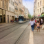 Rue piétonne, démarrage du tramway, voix des gens, signal sonore